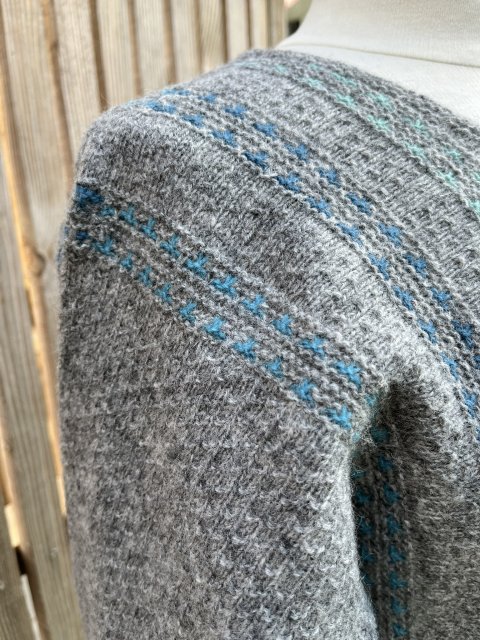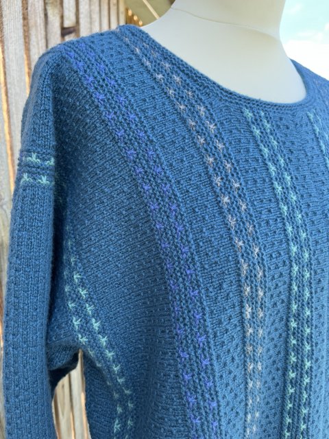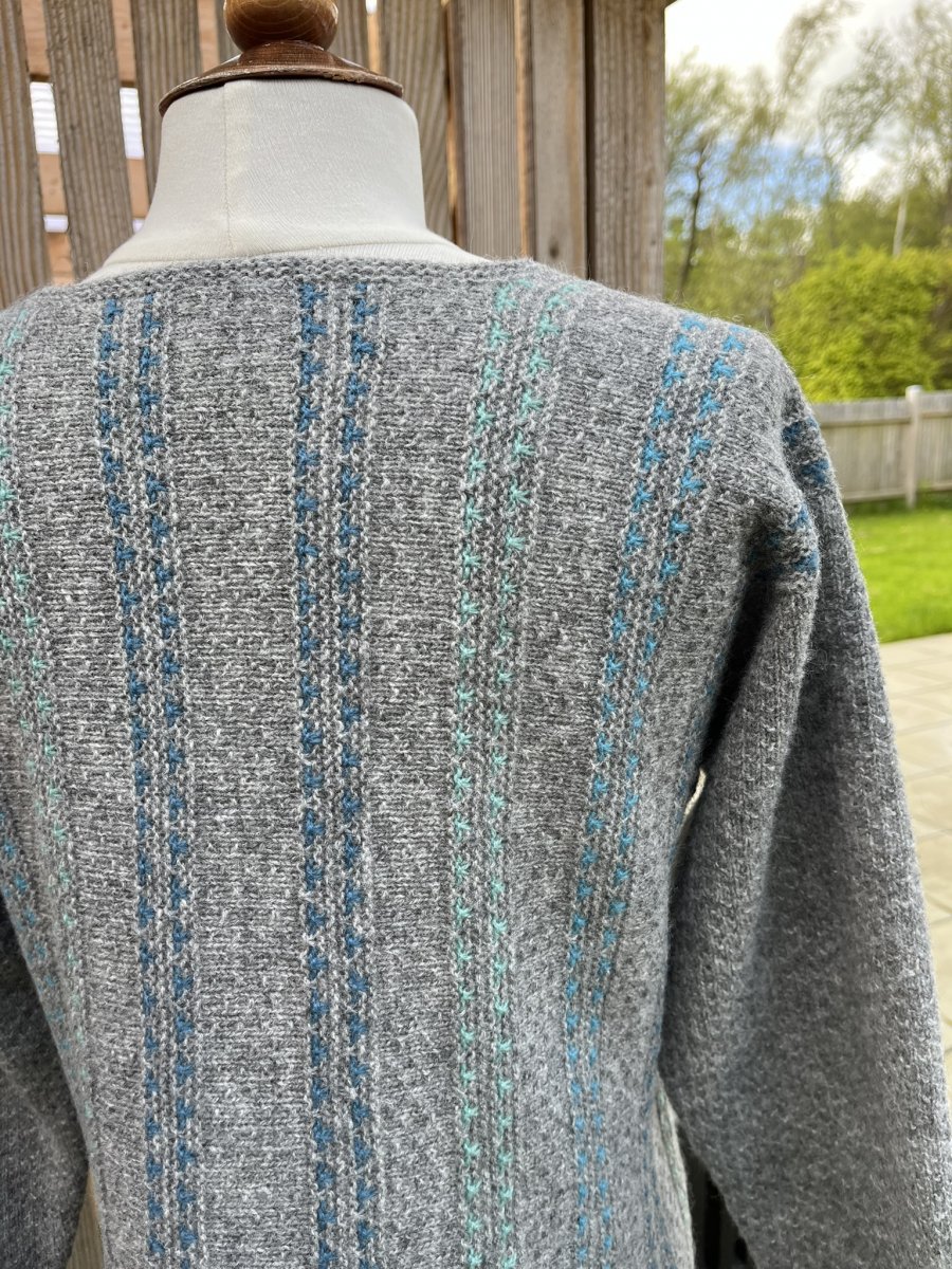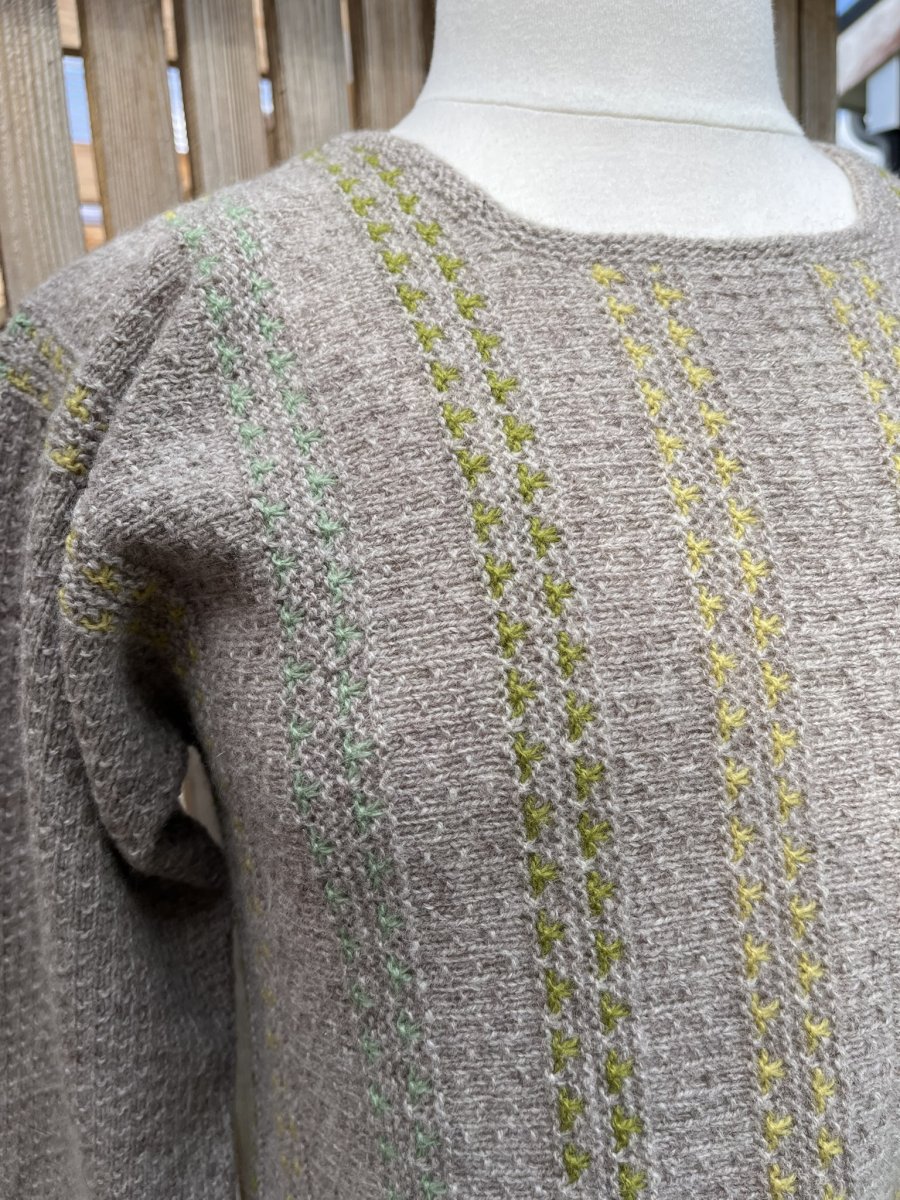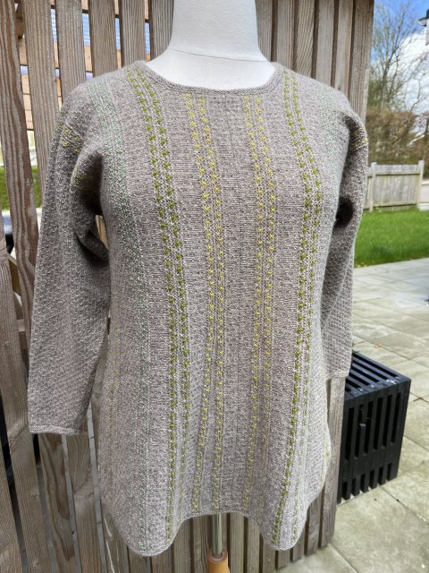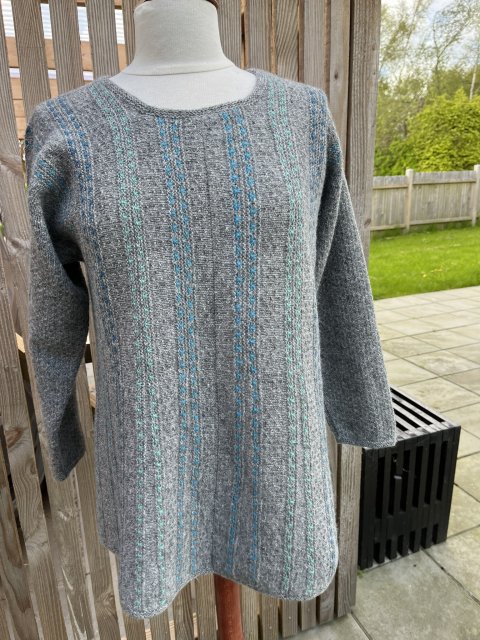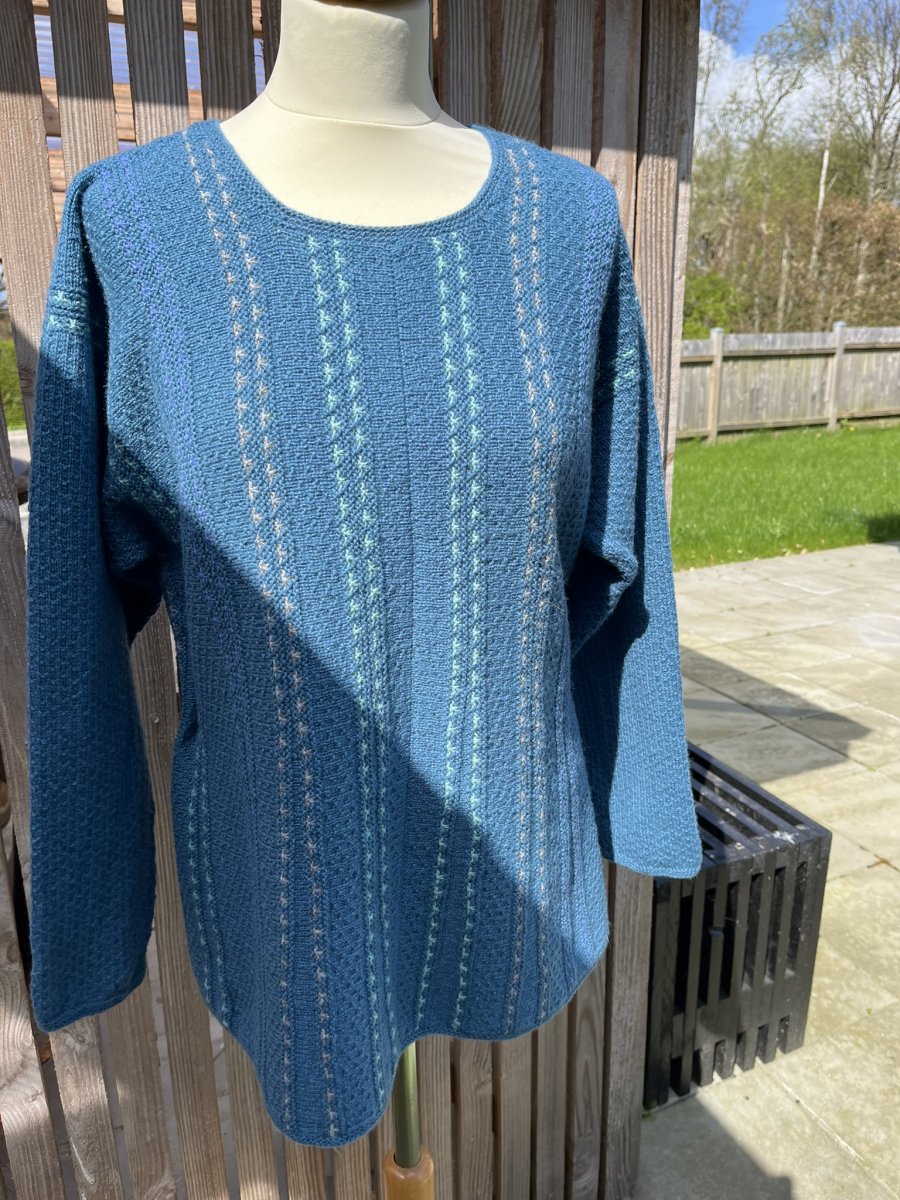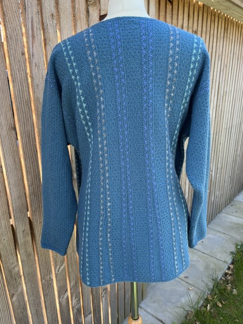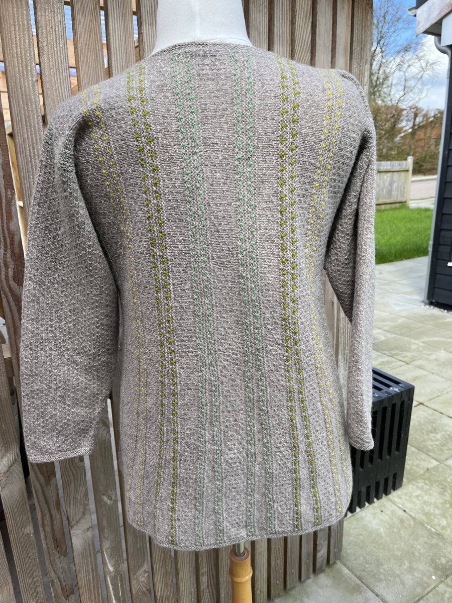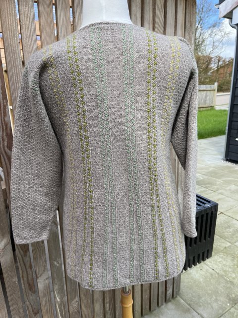 A - facon modellen er startet midt foran og strikket lodret, hvor der er striber med vævestrik, et lille ret/vrang mønster, og så er der lavet kiler med vendestrik. Det gør at trøjen får en god pasform med mere vidde forneden på trøjen.