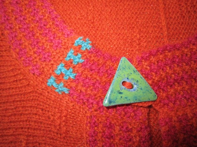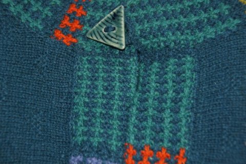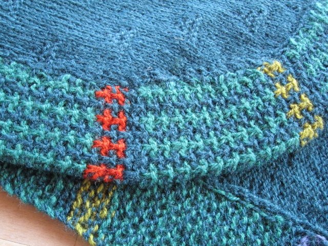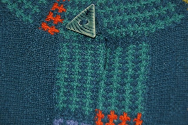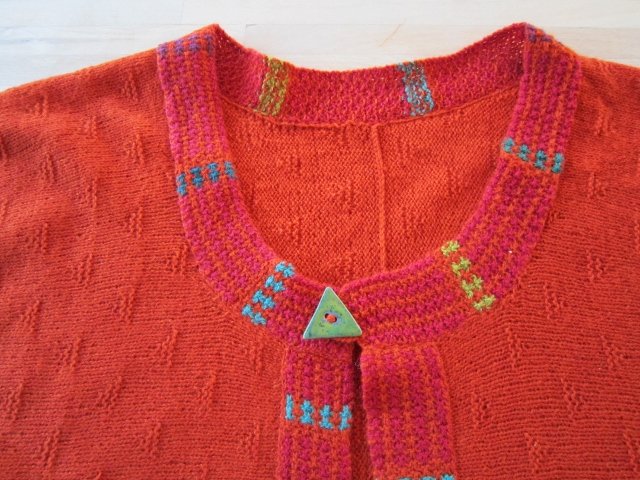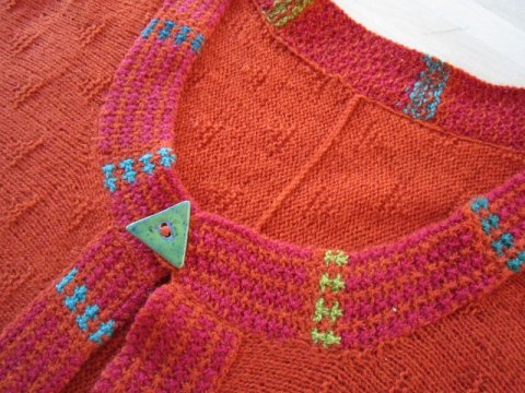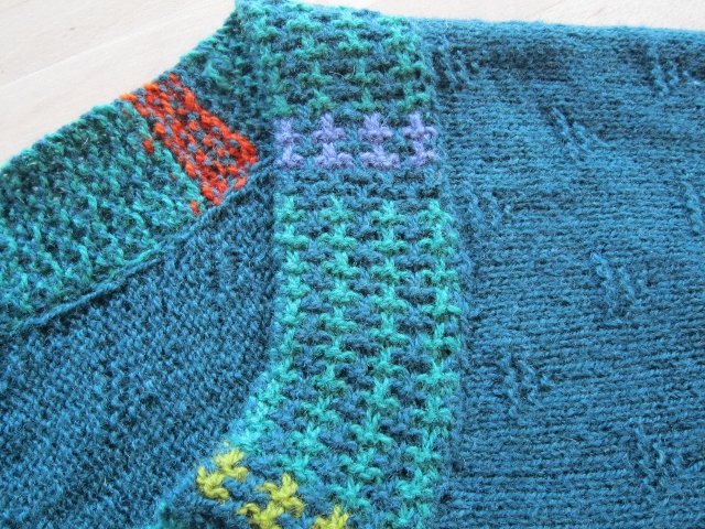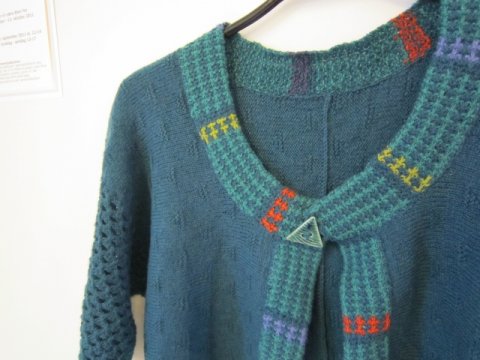Boleroen er strikket med et hulmønster på ærmet og et reliefmønster på [...]for- og bagstykke. Bagefter strikkes en kant i vævestrik, der sys på.