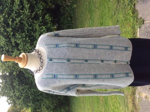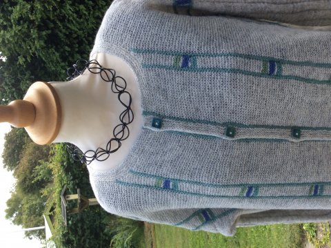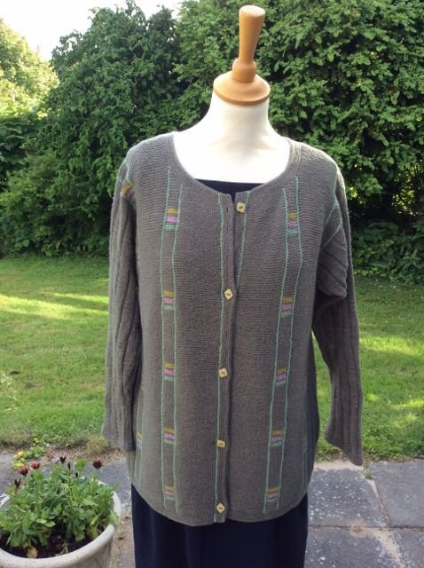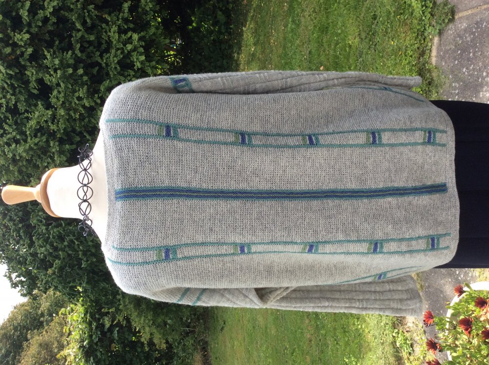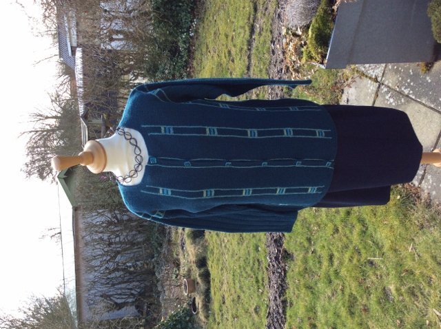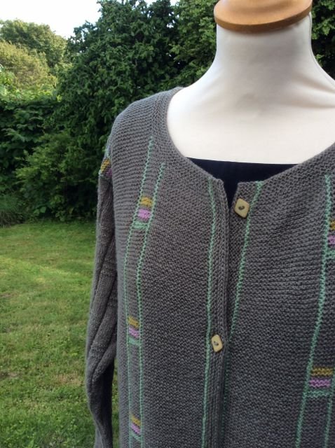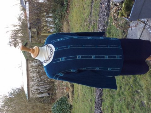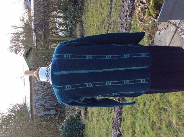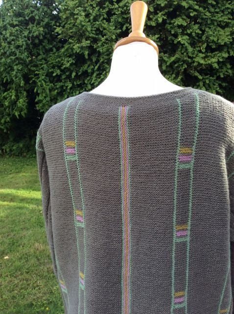 Denne trøje er strikket i baner i dominostrik, hvor man starter med at strikke en smal bane, og i New Zealandsk Lammeuld.