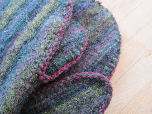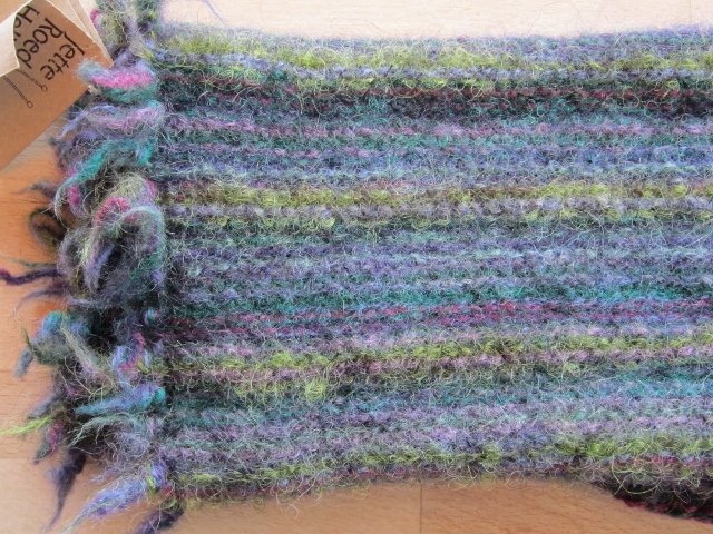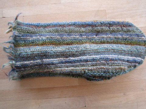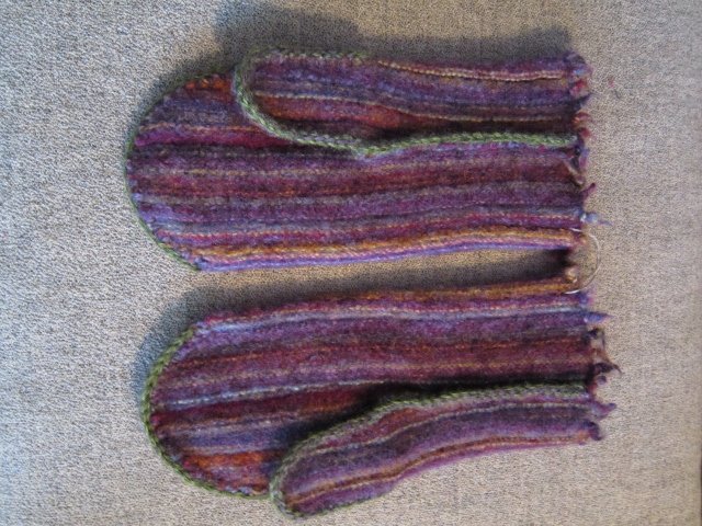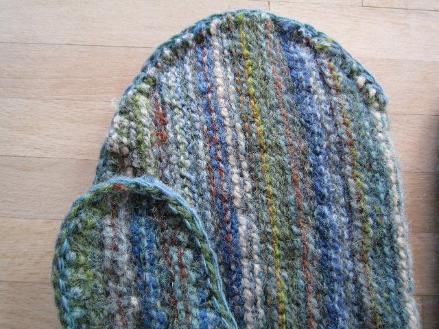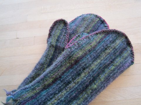 Til disse filtede vanter strikkes et firkantet stykke i retstrik af garn i mange [...]forskellige nuancer fx inden for den blå farveskala og så med lidt kontrastfarver i. Det strikkede stykke vaskes og filtes i vaskemaskinen, og herefter kan man klippe vanterne ud og sy dem sammen til et par meget varme vanter.