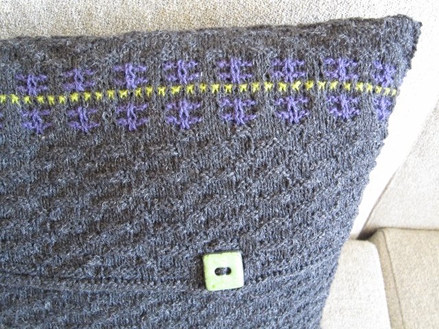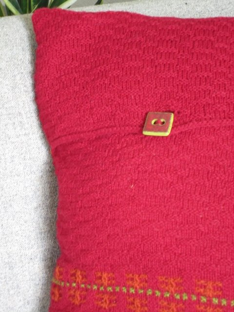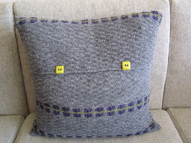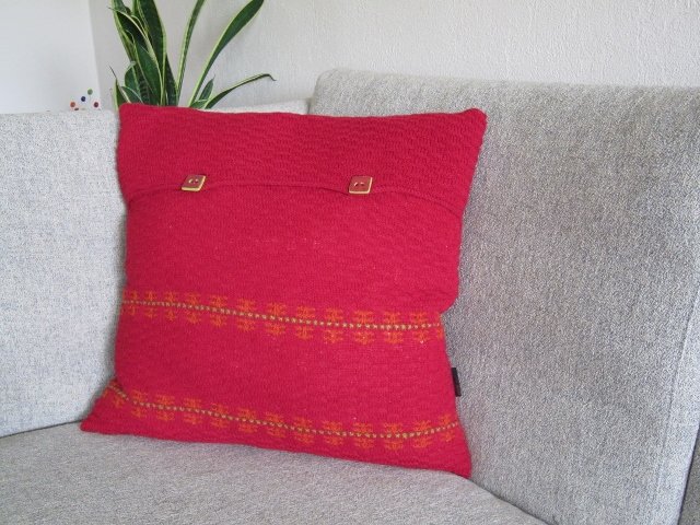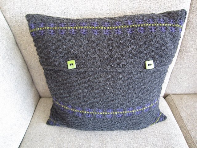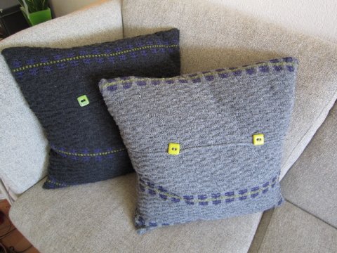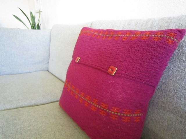 Når puden er færdig,bøjes den sammen og over hinanden, og monteres med 2 store keramik knapper.