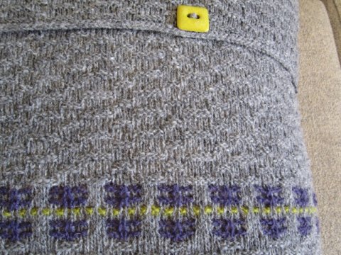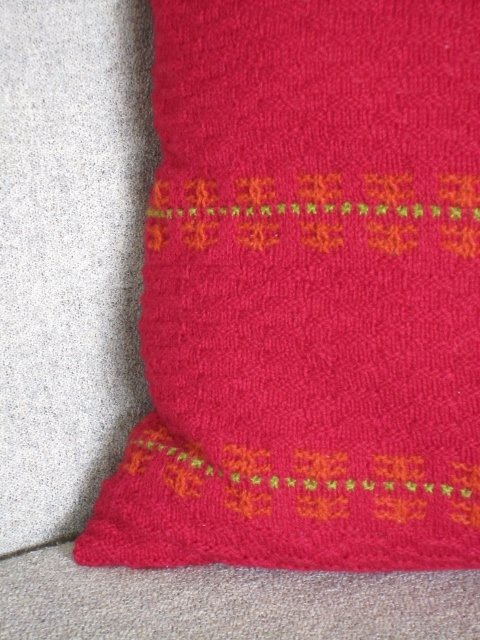 Puden er strikket i et aflangt stykke med nogle striber i vævestrik, hvor der sættes en kontrastfarveind.
