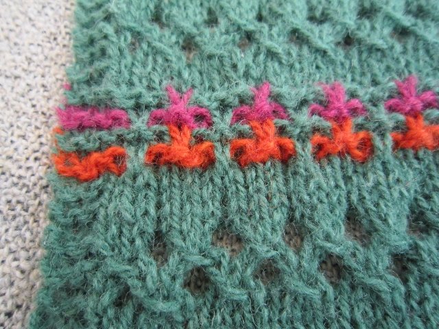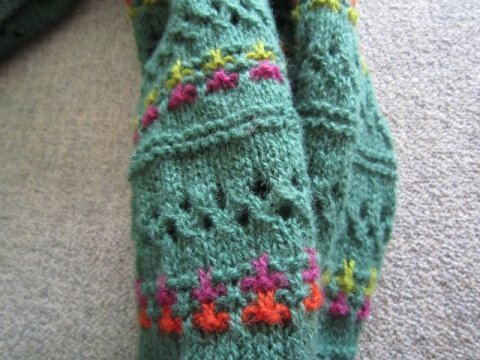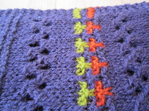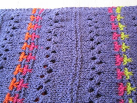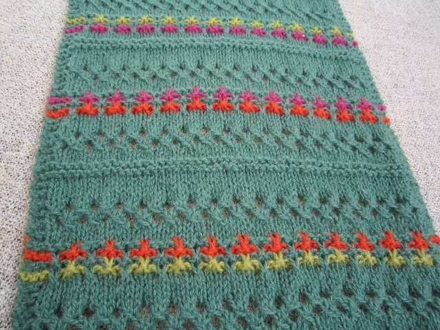 Mønsteret på tørklædet er en kombination af vævestrik, hulmønster og glatstrik, hvor der bruges små kontrastfarver i det vævestrikkede mønster.