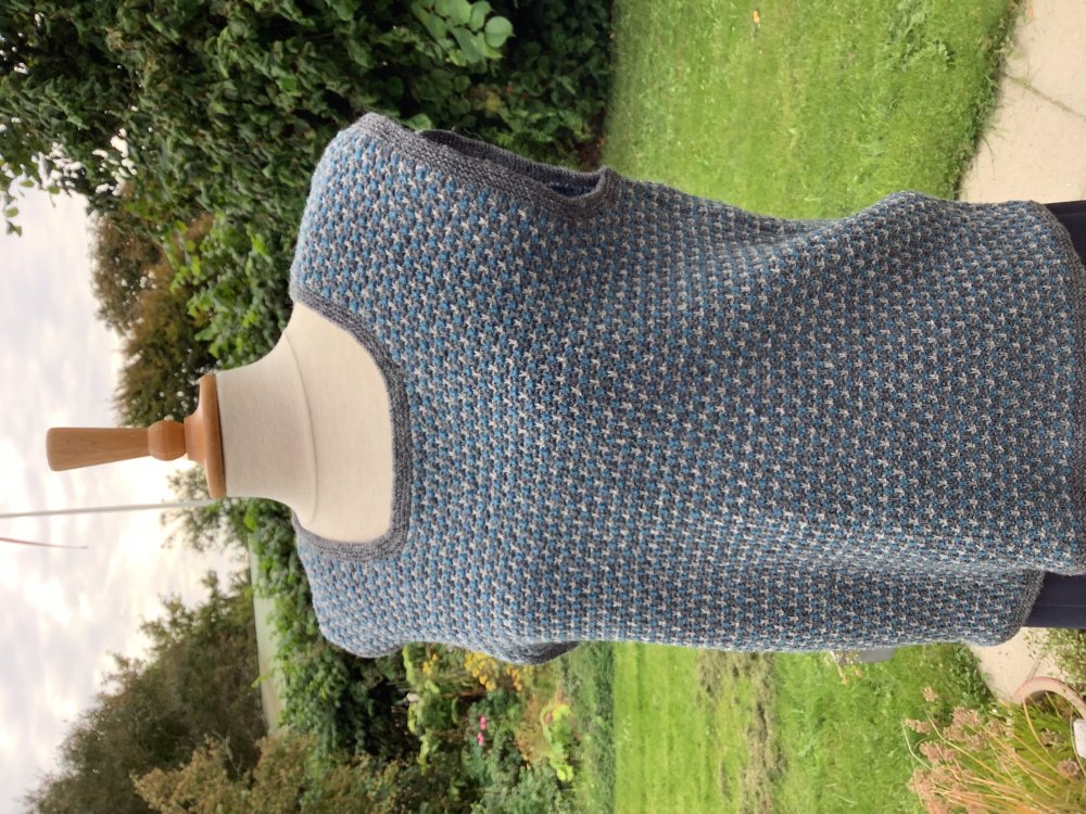 Slipoveren er strikket i 3 farver i vævestrik på hele slipoveren og med ensfarvede kanter i retstrik.