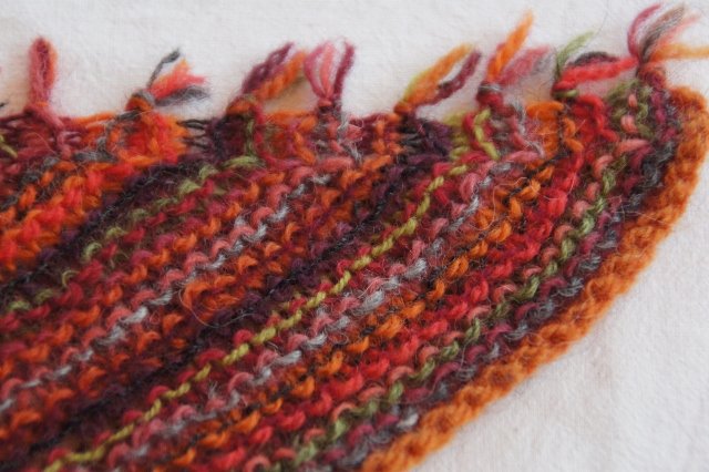 Der slås knuder for enderne, så der skal ikke hæftes en hel masse ender, men man får nogle små fine frynser, der liiger ned foran på sjalet.