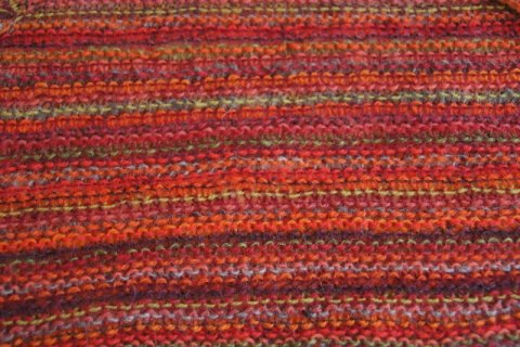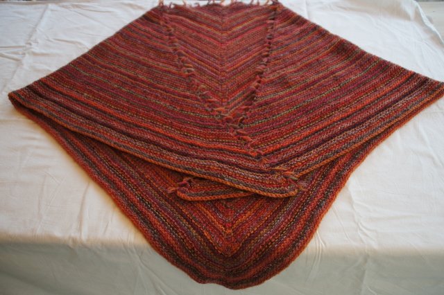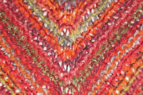 Sjalet er strikket i retstrik i forskellige uldkvaliteter (på pind 5) og i mange nuancer [...]inden for en bestemt farveskala. Fx de røde farver som på billedet og hvor der så er enkelte pinde i en kontrastfarve, hvor der til den røde farve er valgt en grøn kontrastfarve.