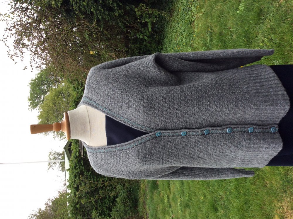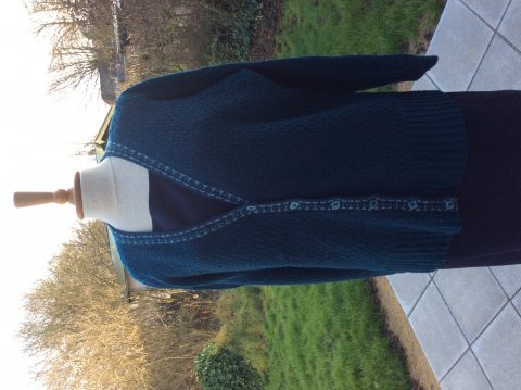 Trøjen er strikket med et lille skød, hvor der er en "ribbet" kant, der giver lidt vidde.