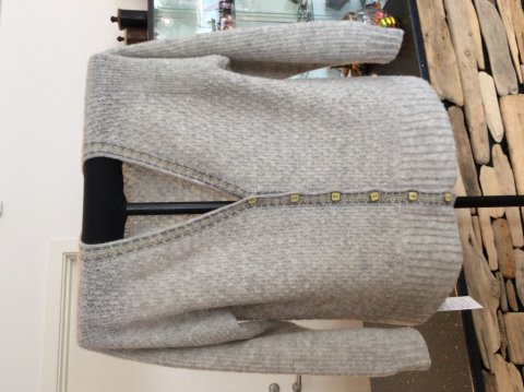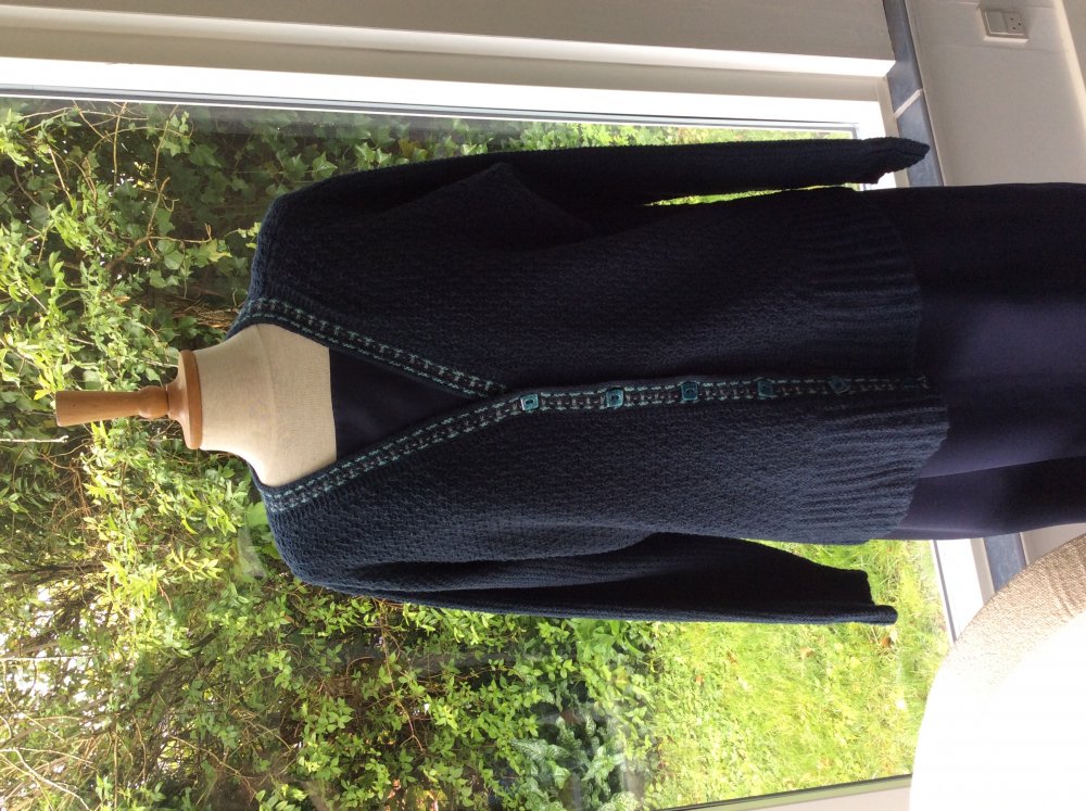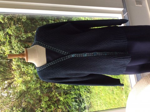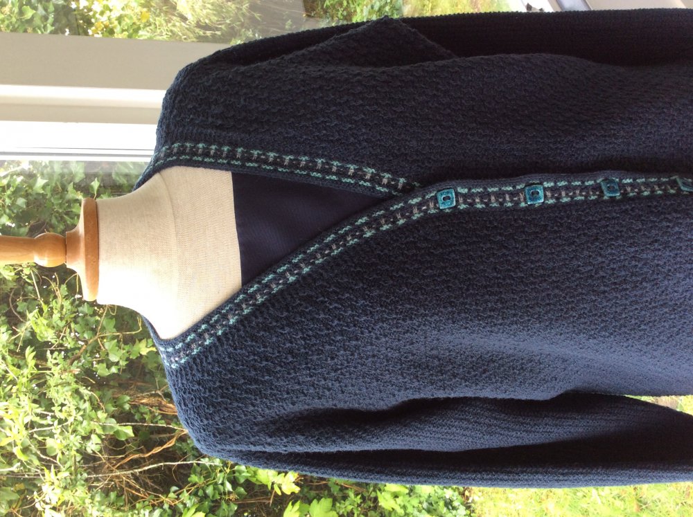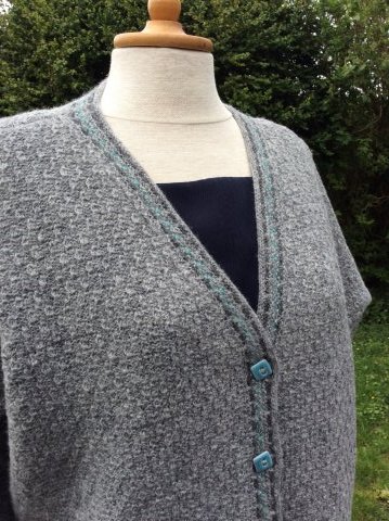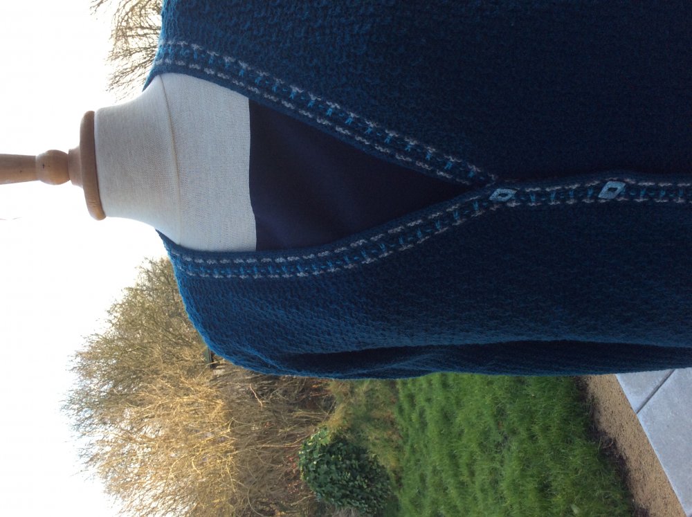 Seilve trøjen er ensfarvet, men på kanten rundt på forstykker og hals er der en lille bort, hvori der er strikket vævestrik og dermed lidt kontrastfarver.