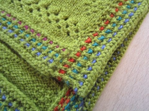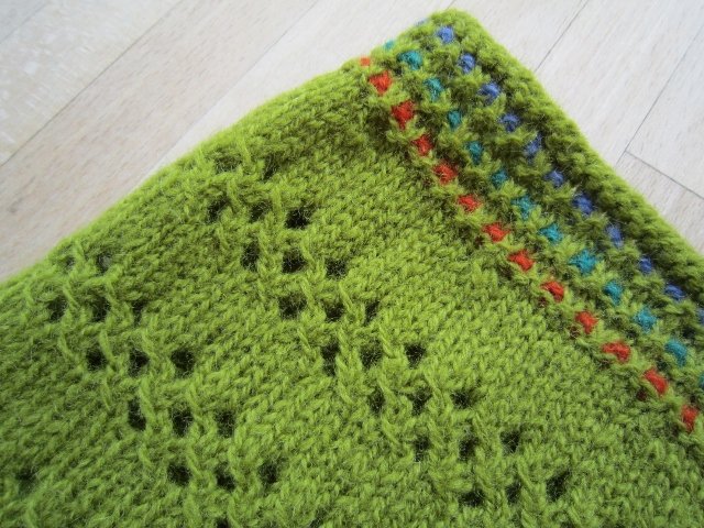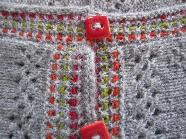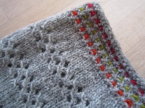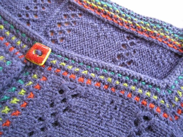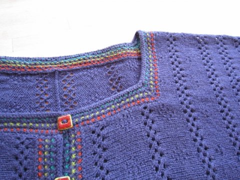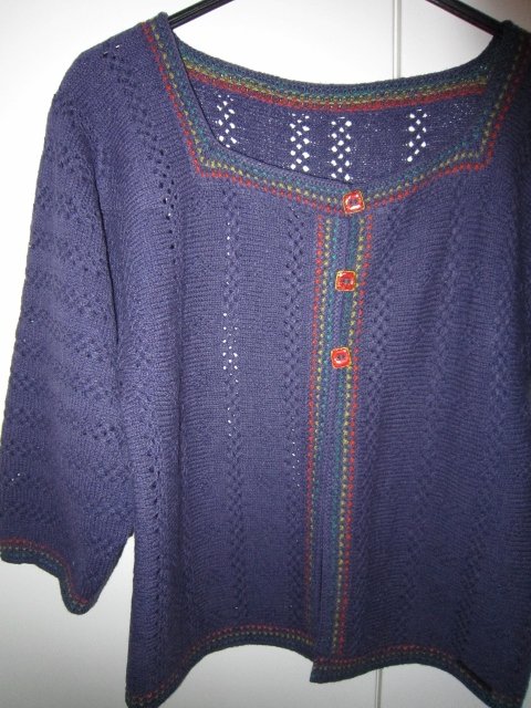 Mønstret på trøjen består af kanter, der er strikket i væ [...]vestrik, og på selve trøjen er det en kombination af et hulmønster, et ret-vrang mønster og glatstrik.