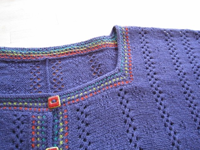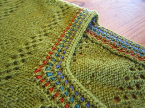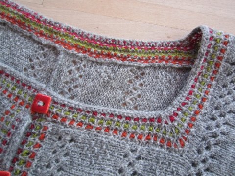 Til sidst strikkes kanter i hals og forneden på trøjen i vævestrik.