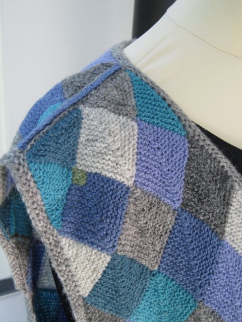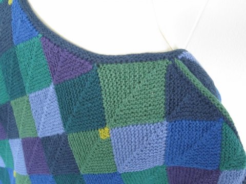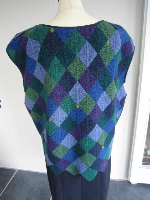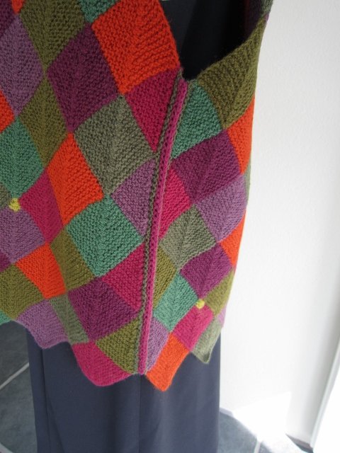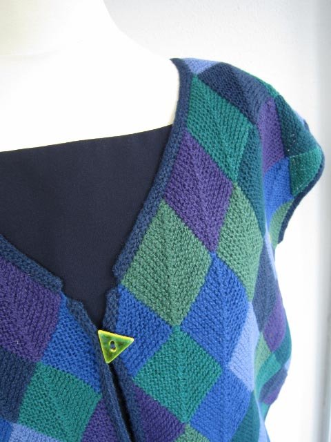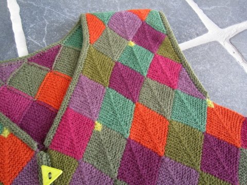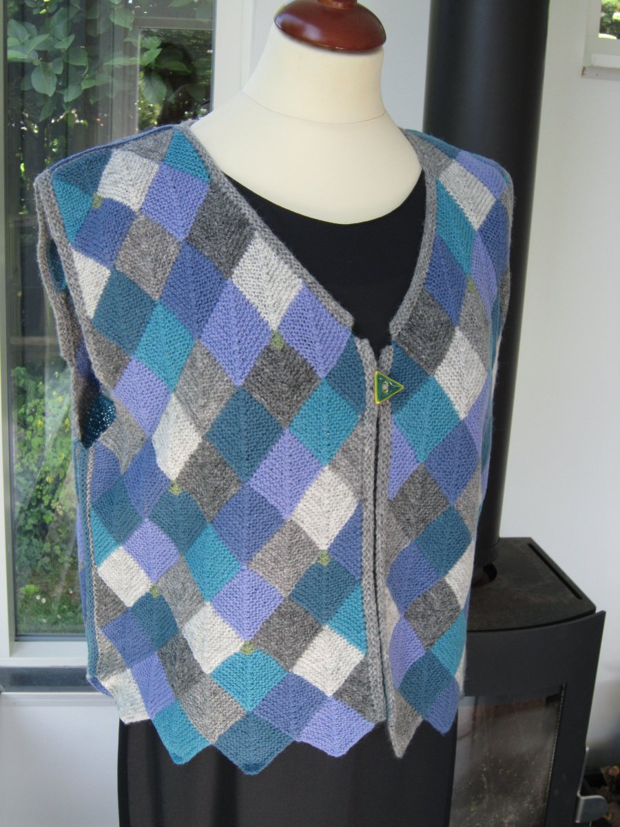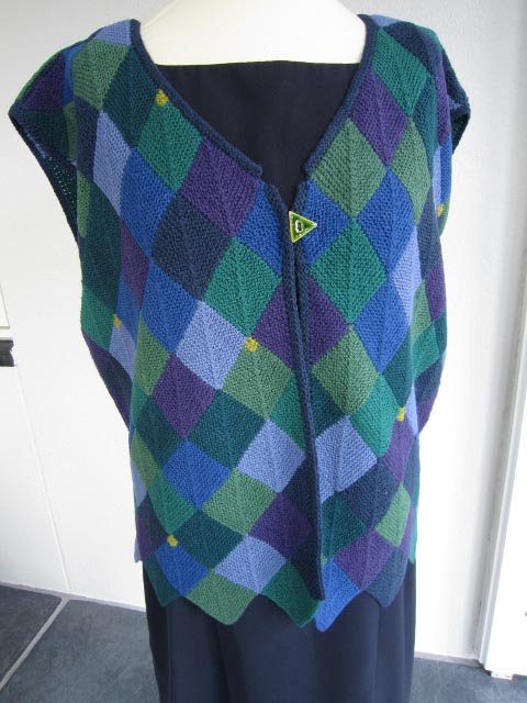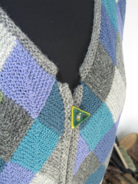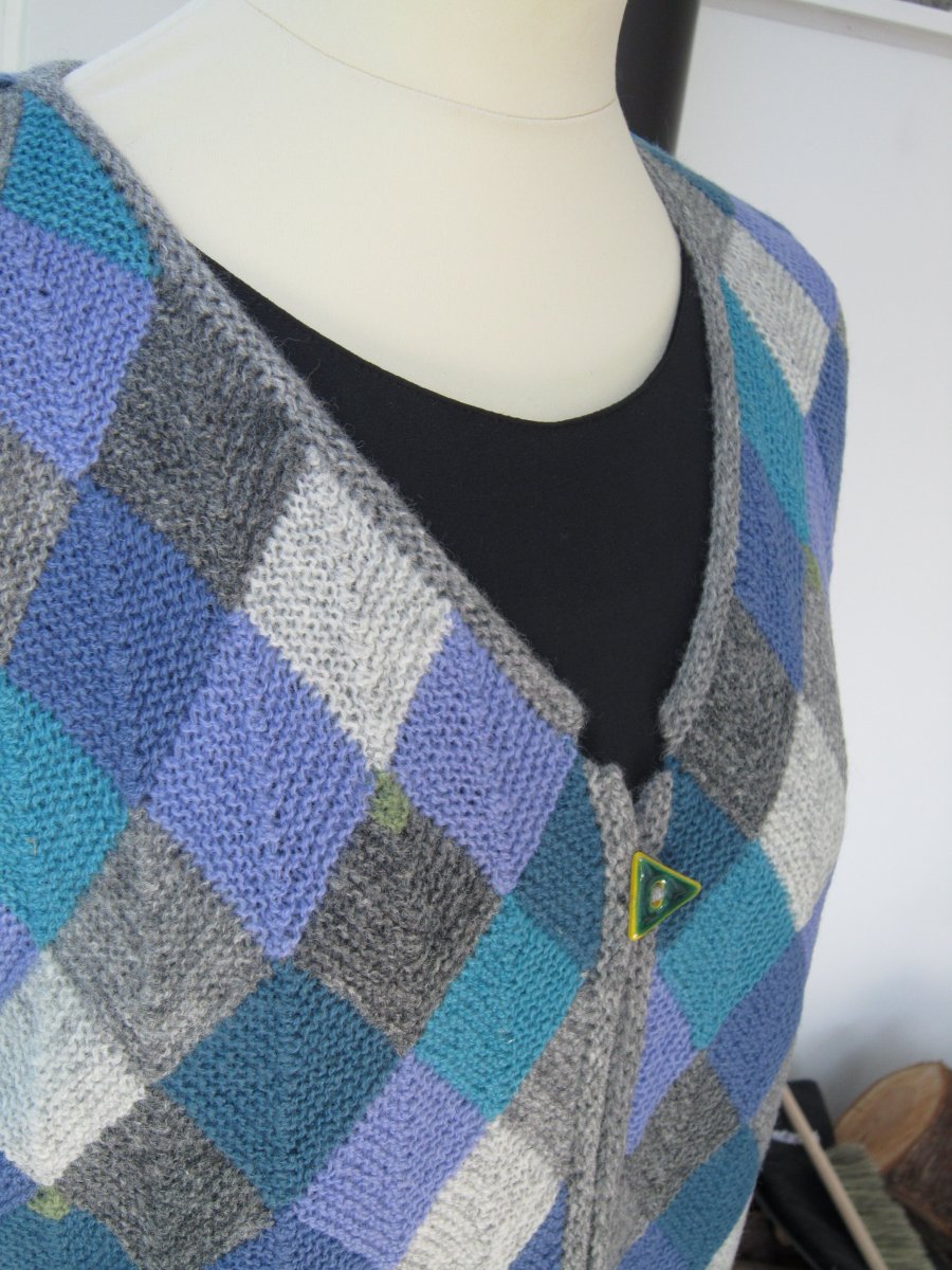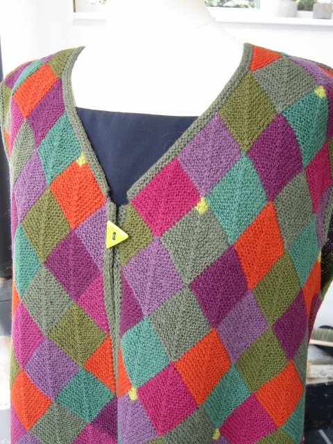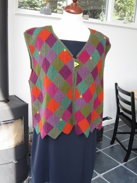 Vesten er strikket i dominostrik, som består af små firkanter i hver sin farve, der er strikket sammen.